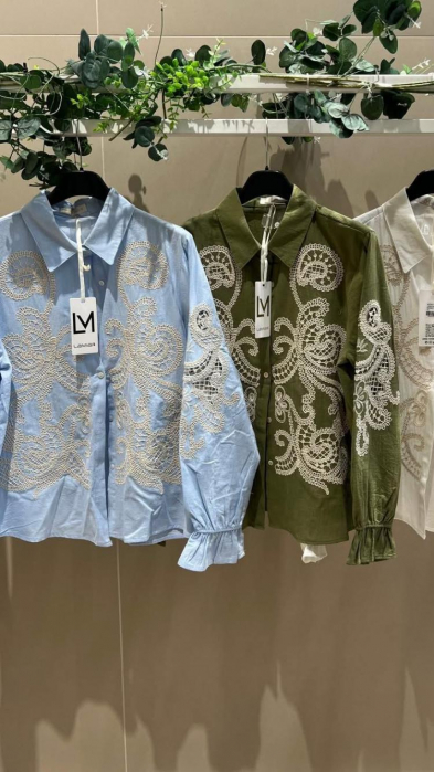 camasa brodata cu dantela, culori alb, KaKi si albastru